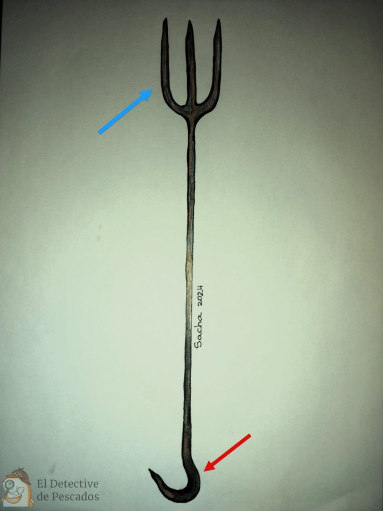 ¿ y la flecha azul? .Pues se trata de otra varilla o pletina4 que puede terminar en un rastrillo con tres o más dientes.Las presas a ensartar, y siempre bajo la noble tarea del marisqueo intermareal,despliega el siguiente catálogo no agotado: CHOCOS, LENGUADOS VARIOS,MORENAS, ANGUILAS …o cualquier otro pez que sea menester.En este caso el instrumento recibe el nombre de FISGA
