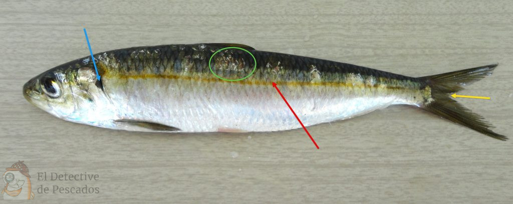 Empezamos por lo que nos señala la FLECHA ROJA: una LINEA AMARILLA que supone el elemento clave para diferenciar a la ALACHA3 , que además sirve como inspiración para nombrar científicamente al pez S.aurita ( nos remite al oro).