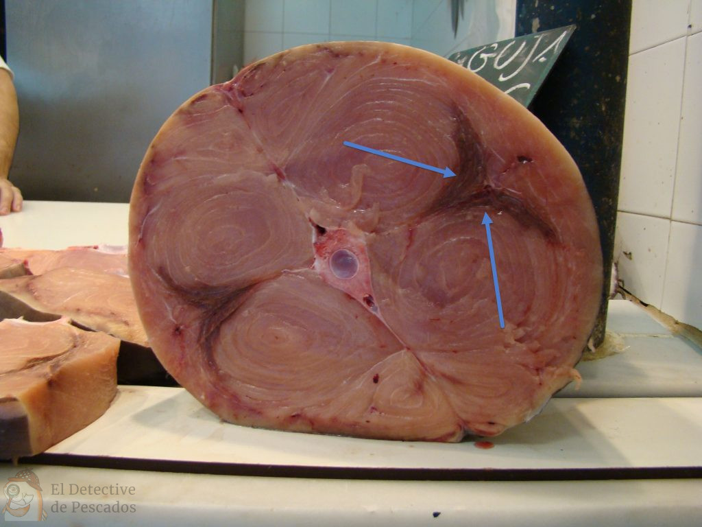 Las LAS FLECHAS AZULES nos señalan el dibujo típico de la musculatura roja de un corte de pez espada que nos va a facilitar en gran medida diferenciar a este pescado de otros «imitadores» y» defraudadores».3