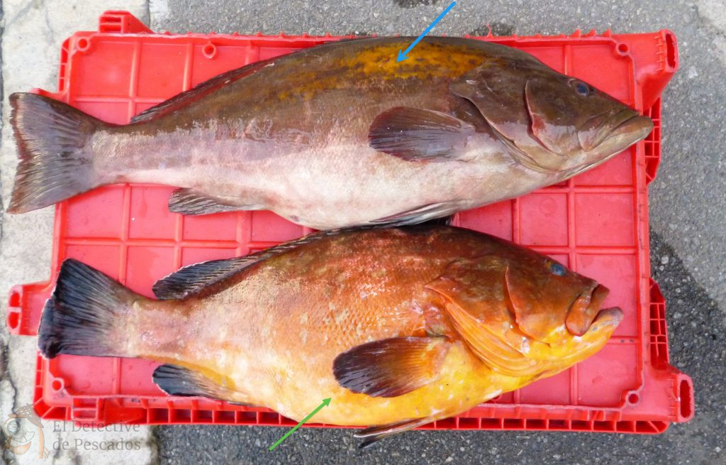 - El FALSO ABADEJO o MERO DORADO tiene de nombre científico Epinephelus costae (Steindachner,1878). Con la flecha azul señalamos la mancha amarilla que distingue a los MACHOS REPRODUCTORES de la especie.
