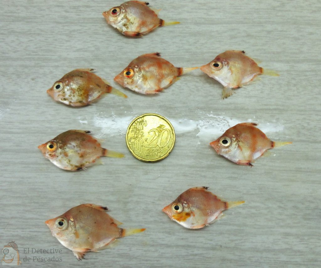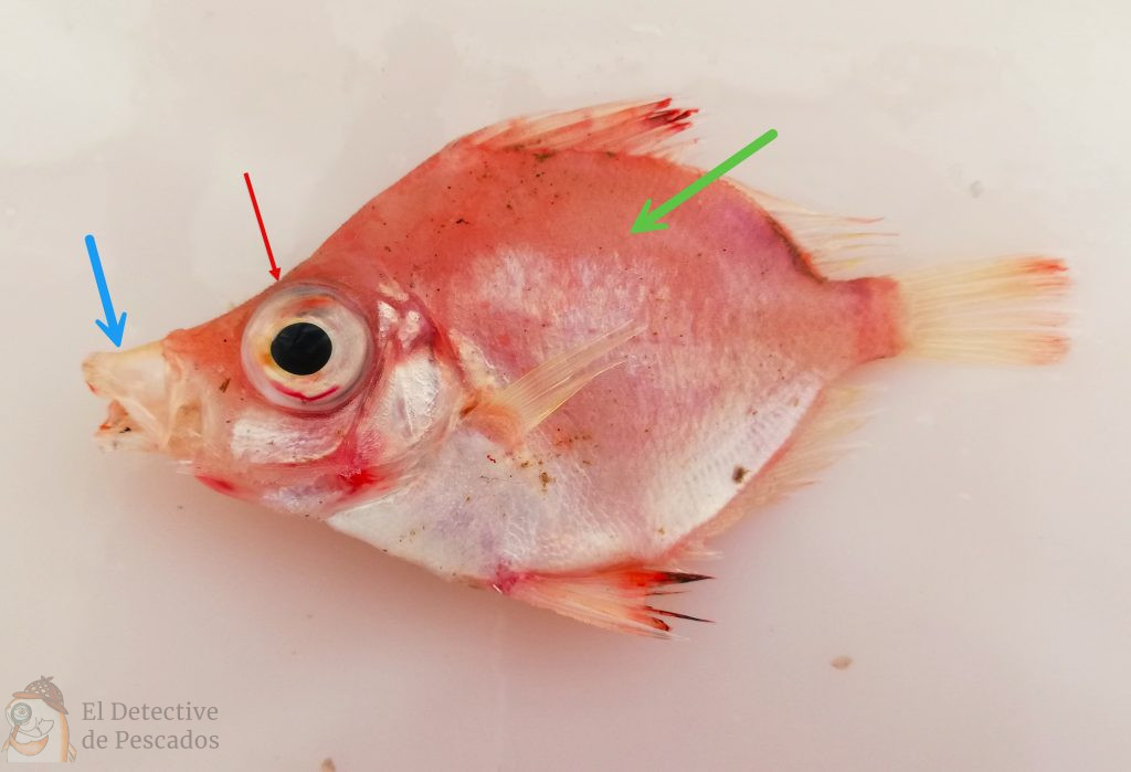 Flecha roja: Resalta sus grandes ojos que junto al tono rojizo del pez ,nos da pistas sobre la profundidad en la que viven una vez alcanzada la madurez( de 100 a 450 metros). Según se acerque a la superficie virará de un rojo fuerte a un anaranjado, para terminar en casi plateado si sigue ascendiendo. En los individuos muy jóvenes, que suelen frecuentar zonas arenosas, puede adquirir un aspecto amarillo para poder confundirse con el color de su entorno.4