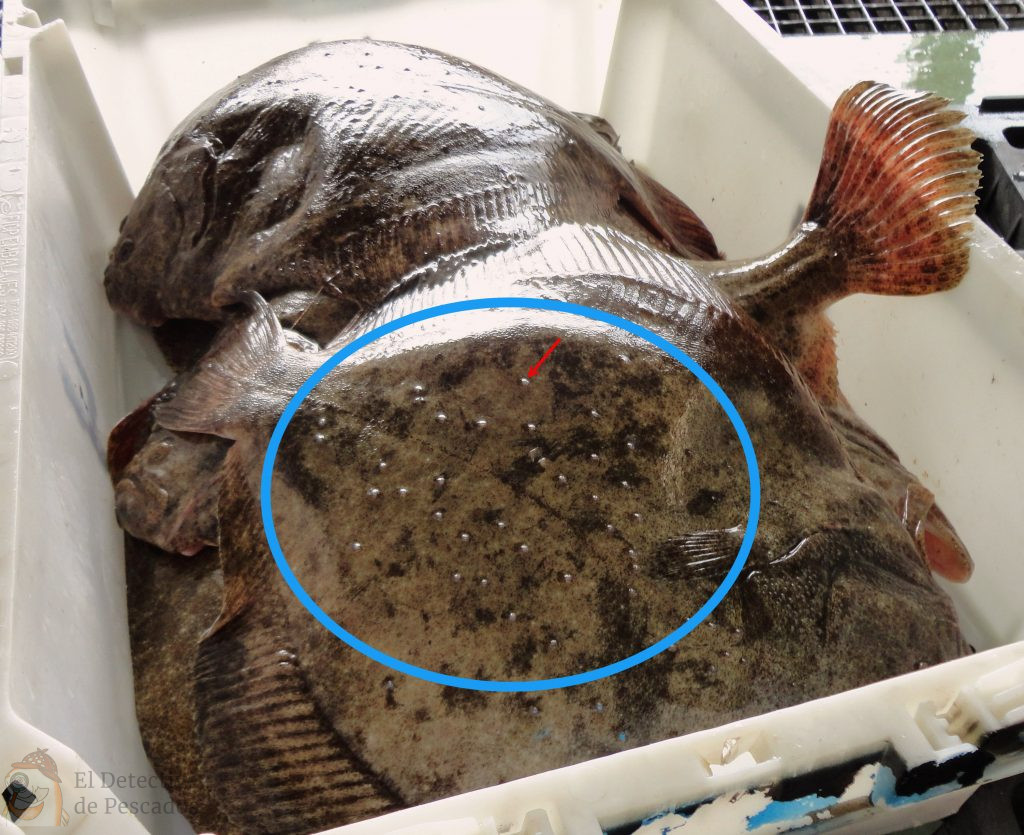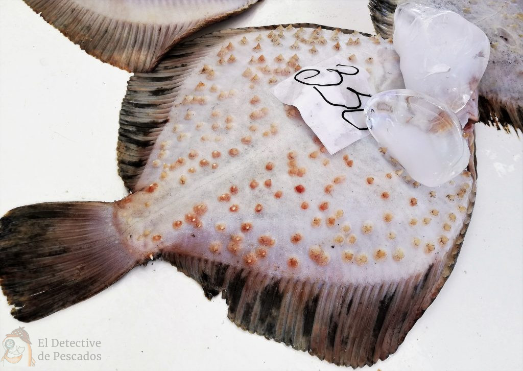 Con el circulo azul hemos encerrado a un grupo de TUBÉRCULOS ÓSEOS y con la flecha roja les señalamos uno concreto. Para terminar en la leyenda de la parte inferior de la imagen ya lo dejamos claro: ES EL RODABALLO2 EL QUE TIENE TUBÉRCULOS. EL RÉMOL3 NO